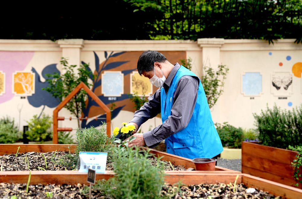 上海市長寧區虹旭小區居民在整理改造社區花園。居民們把堆肥箱裏發酵出來的“綠色材料”和土壤拌在一起鋪在種植箱中