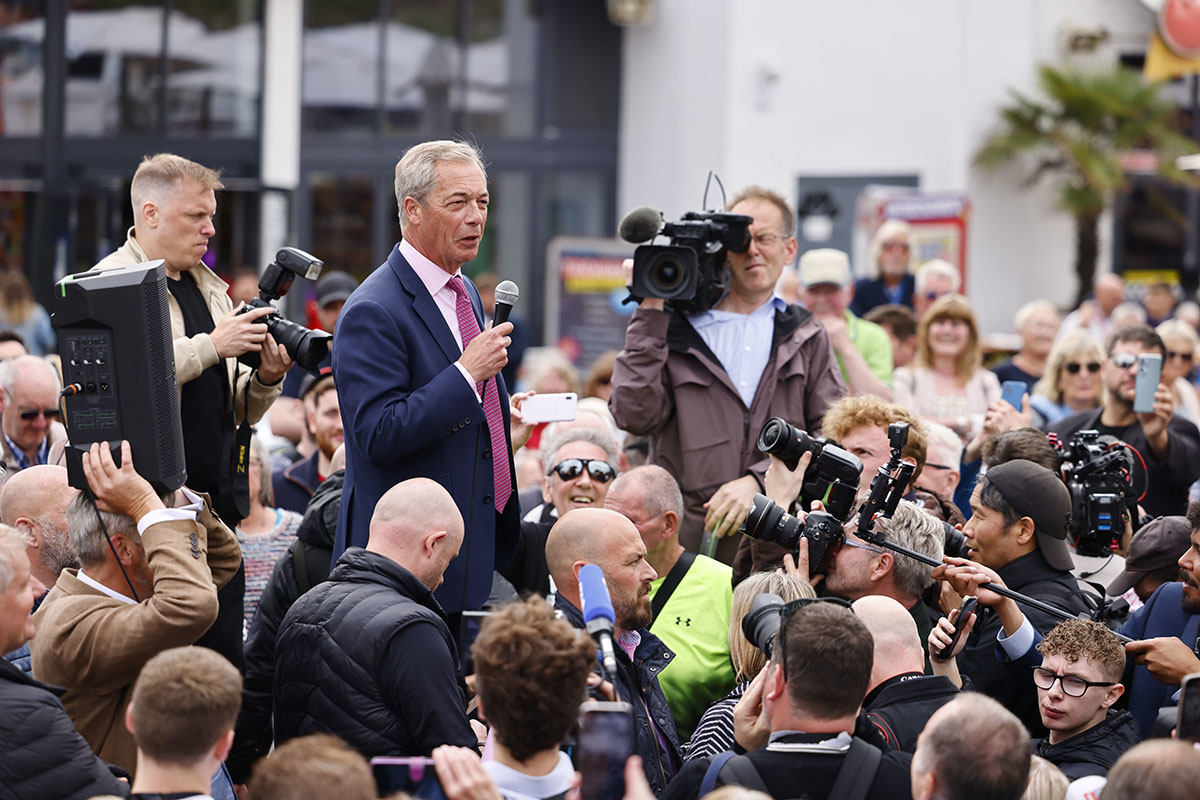 當地時間6月4日,法拉奇在英格蘭克拉克頓選區啓動個人競選活動(澎湃影像)