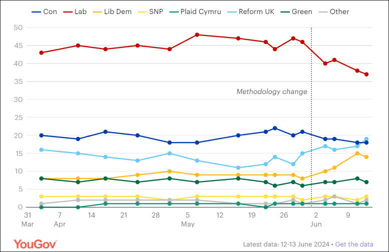 根據民調機構YouGov在6月12日至13日進行的調查,英國工黨以37%的支持率位居第一,英國改革黨的支持率從先前的17%上升到19%,排在第二位。英國保守黨的支持率則保持不變,仍為18%,落後改革黨1個百分點。