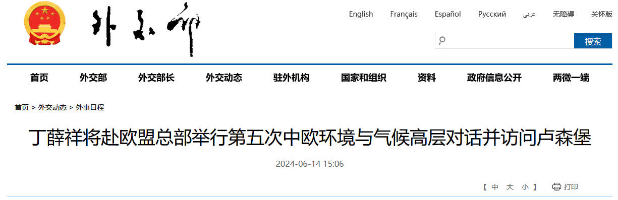 經中歐雙方商定,並應盧森堡副首相貝泰爾邀請,中共中央政治局常委、國務院副總理丁薛祥將於6月17日至21日赴布魯塞爾歐盟總部舉行第五次中歐環境與氣候高層對話,並訪問盧森堡。