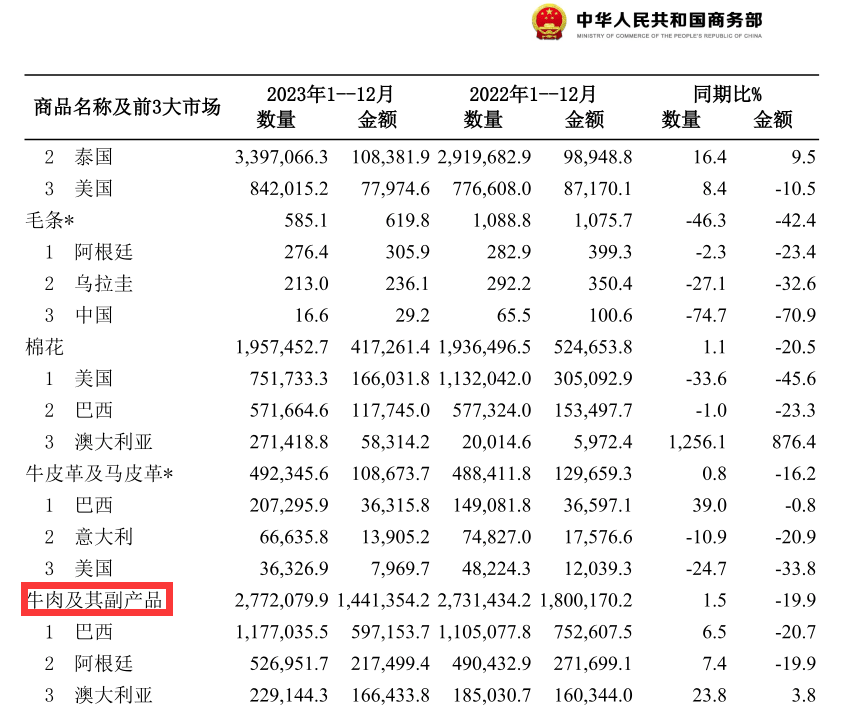 比如根據中國商務部相關數據,2023年我國牛肉及其副產品進口前3大市場為巴西(約42.4%)、阿根廷(約19%)和澳大利亞(約8%),因此我國從阿根廷進口牛肉額並非最大。