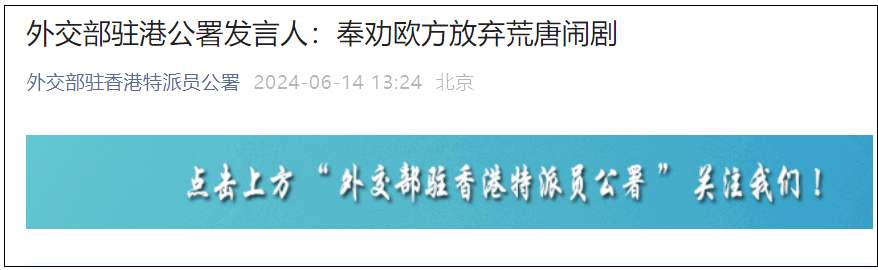 微信公眾號“外交部駐香港特派員公署”6月14日消息,針對歐盟發表2023年度涉港報告,惡意攻擊“一國兩制”,抹黑香港民主法治,為黎智英、鄒幸彤等反中亂港分子鳴冤叫屈,粗暴干涉香港事務和中國內政,外交部駐港公署發言人表示強烈不滿和堅決反對,強調指出: