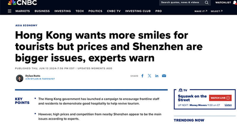 6月13日,美國消費者新聞與商業頻道(CNBC)報道:“香港政府已啓動一項活動,鼓勵一線員工和居民展示良好的待客之道,以助力旅遊業恢復。” 但該報道又稱,“有專家説,高物價和來自深圳的競爭力似乎才是主要問題。”