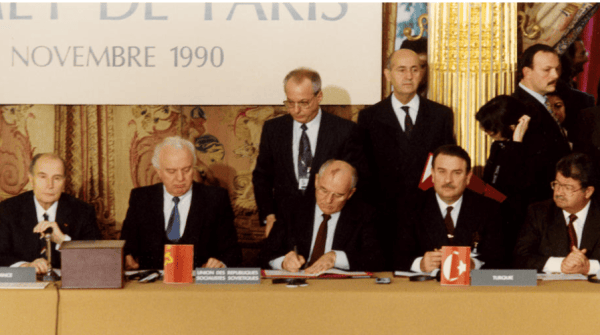 1990 年 11 月 19 日,在巴黎舉行的歐洲安全與合作會議首腦會議期間,蘇聯總統戈爾巴喬夫簽署了《歐洲常規武裝力量條約》