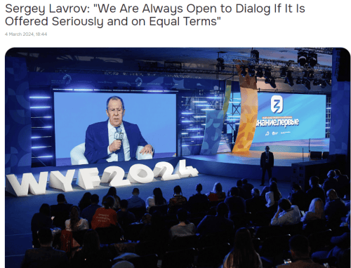 俄羅斯外長拉夫羅夫在今年3月4日世界青年節的會議上發言:“如果對話是在平等的條件下認真進行的,我們始終持開放態度”。