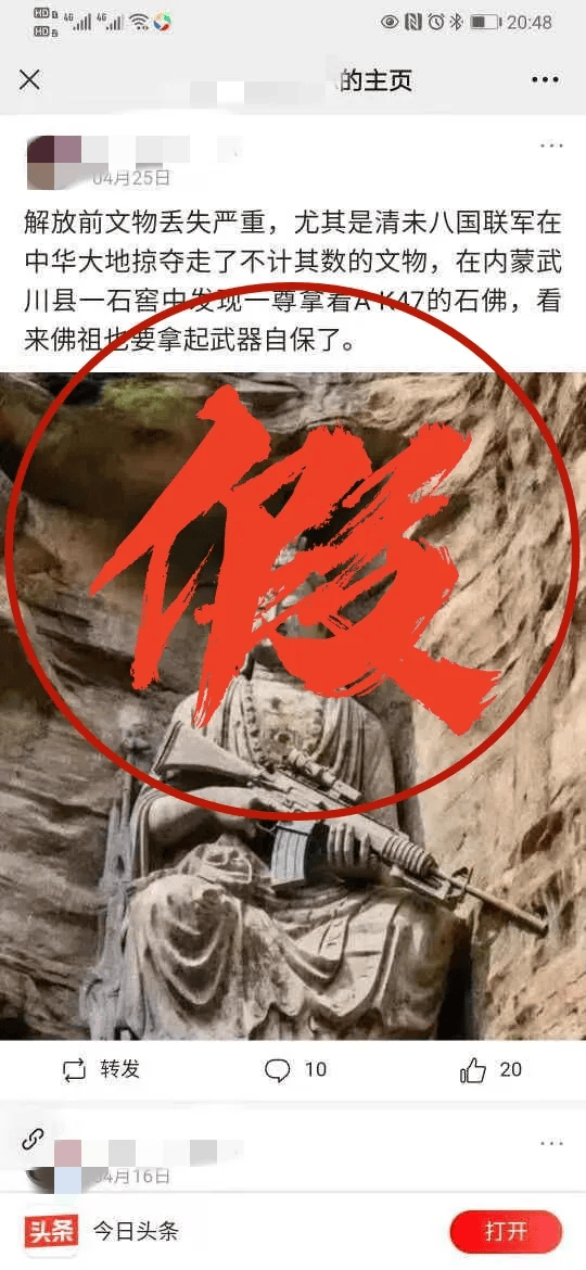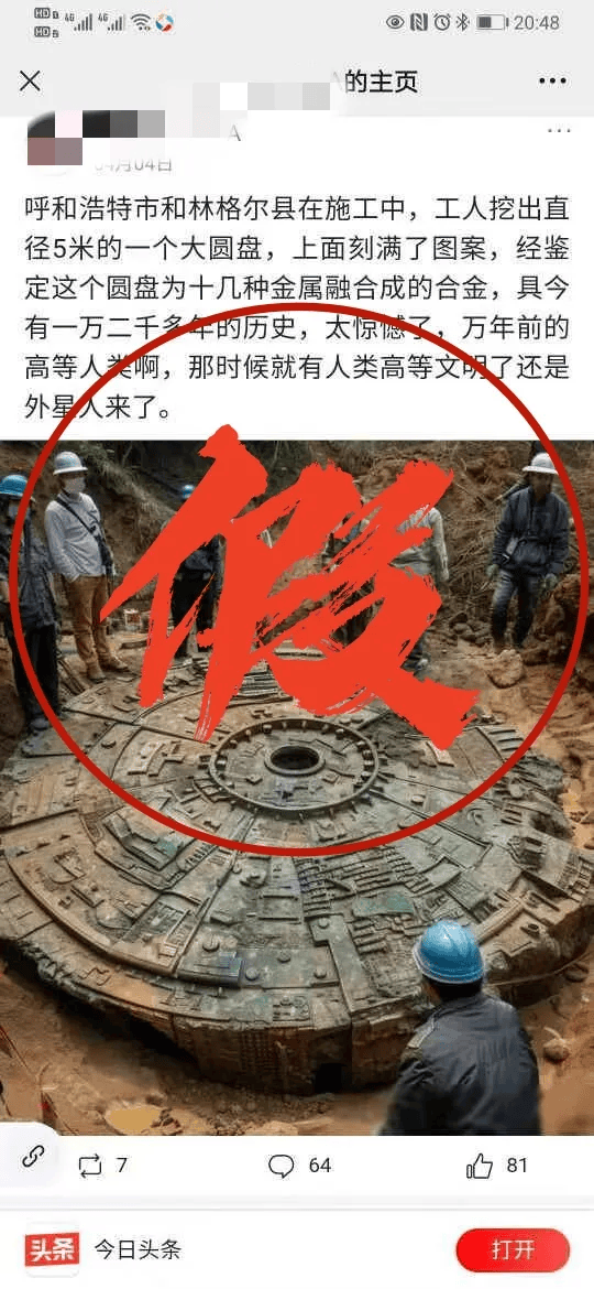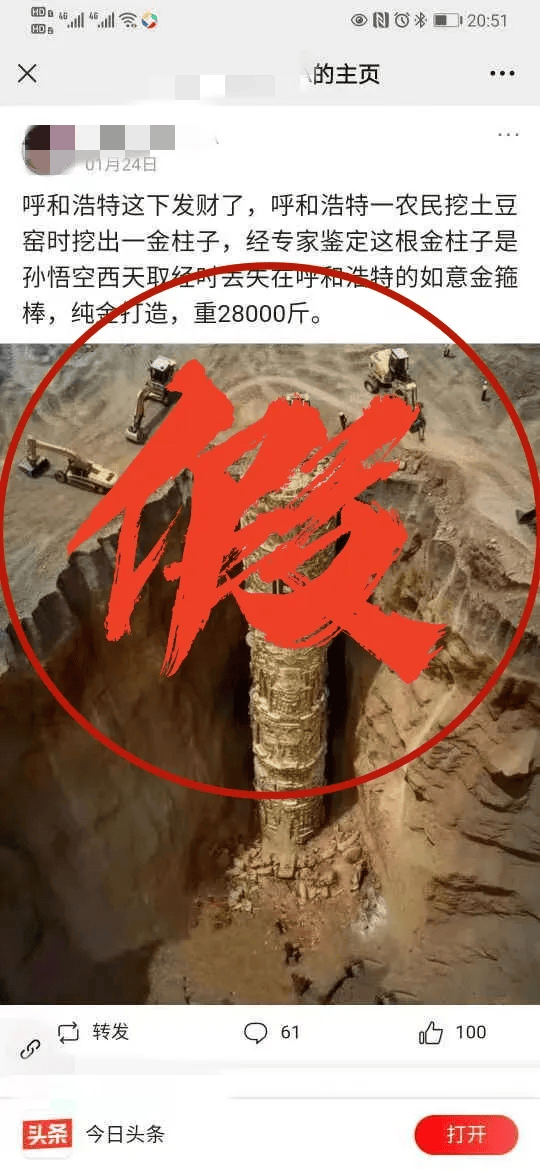 “呼和浩特一農民挖土豆窯時挖出一金柱子。經專家鑑定這根金柱子是孫悟空西天取經時丟失在呼和浩特的如意金箍棒,純金打造,重28000斤。”“呼和浩特市和林格爾縣在施工中,工人挖出直徑5米的一個大圓盤,上面刻滿圖案,經鑑定這個圓盤為十幾種金屬融合成的合金,距今有一萬二千多年的歷史,太驚憾了,萬年前的高等人類啊,那時候就有人類高等文明瞭,還是外星人來了。”近日,民警在工作中發現轄區居民王某某在其社交賬號上發佈多條非常荒唐的圖片信息,同時配有文字,聲稱在呼和浩特大青山、和林格爾等地方,發現了巨大的合金圓盤、刻有圖案的石頭,更加離譜的是,王某某還發出村民與外星人的合影。雖然信息荒唐至極,但關注量卻不少,獲得大量網民點贊和評論。