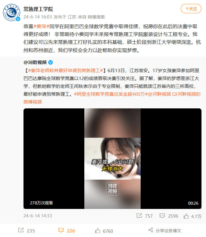 14日,常熟理工學院官方微博發文稱,“恭喜姜萍同學在阿里巴巴全球數學競賽中取得佳績,祝願你在此後的決賽中取得更好成績! 非常期待小姜同學未來報考常熟理工學院服裝設計與工程專業。我們建議可以先來常熟理工打好紮實的本科基礎,碩士階段到浙江大學繼續深造。杭州和蘇州很近,我們學校會全力以赴幫助你實現夢想。”