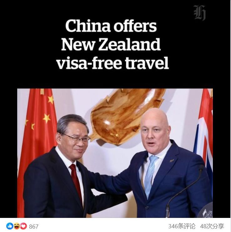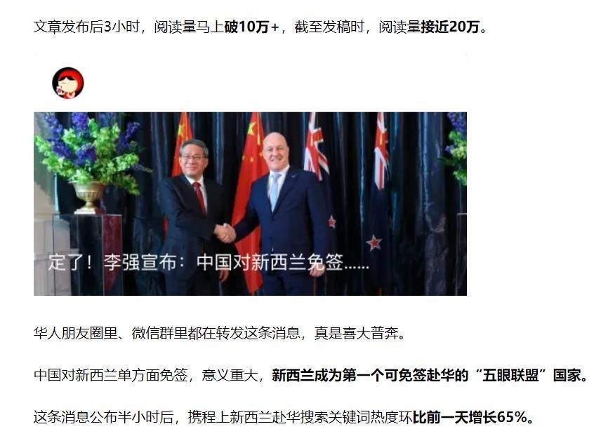 這條信息在中國國內聽起來沒什麼,畢竟新西蘭是個小國,但在新西蘭卻算是一個重磅新聞。新西蘭一家中文媒體發佈了這條新聞後,短時間內得到20萬的閲讀量,而新西蘭華人人口總共才25萬人。
