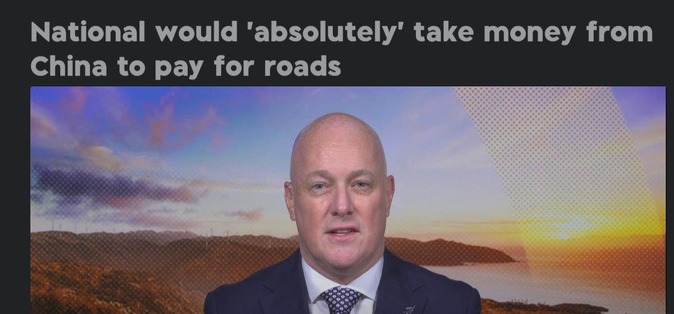 新西蘭1news在上次大選期間報道:拉克森表示將“絕對”接受中國投資新西蘭的道路建設項目