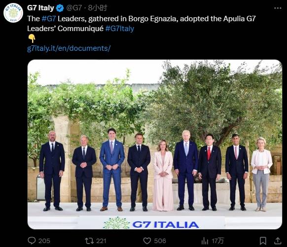 根據G7官方網站消息,G7領導人在意大利南部普利亞大區舉行為期兩天的會談後,於當地時間14日達成“聯合公報”,表達了在俄烏衝突、加沙衝突、“印太”地區等議題的一致立場。