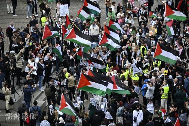 5月9日,上萬人在瑞典馬爾默抗議以色列在加沙地帶的軍事行動,支持巴勒斯坦(澎湃影像)