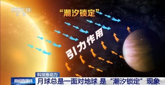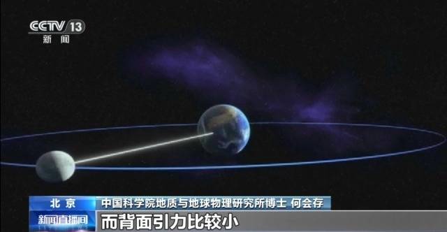 中國科學院地質與地球物理研究所博士 何會存:歷史上並不是這樣的,並不是月球始終只有一面朝向地球,地球和月球在形成之初,地球對月球的吸引力,就是距離地球近的這一面的引力比較大,而背面引力比較小,就會導致月球有一個形變,在旋轉過程中月球其實並不是一個正圓,它被拉長了,這個旋轉過程就不是很穩定。