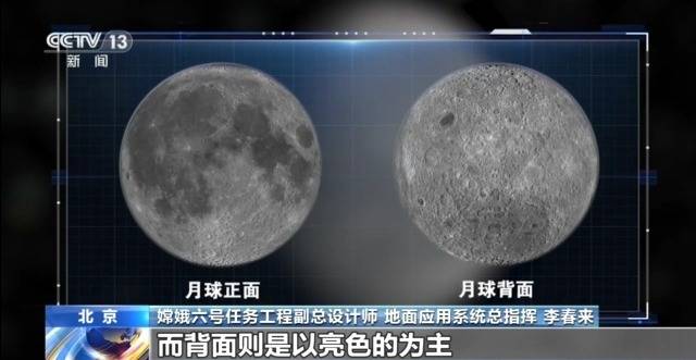 嫦娥六號任務工程副總設計師、地面應用系統總指揮 李春來:月球正面和背面自從我們開展月球探測後,發現它們有非常大的不一樣,從色彩的影調上看,月球正面主要是以暗黑色的色調為主,而背面則是以亮色的為主,實際上這可能是它的成分不一樣引起的。正面主要是暗黑色的玄武岩大片、大面積分佈,而背面更多的是亮白色的斜長巖分佈,對比非常強烈。