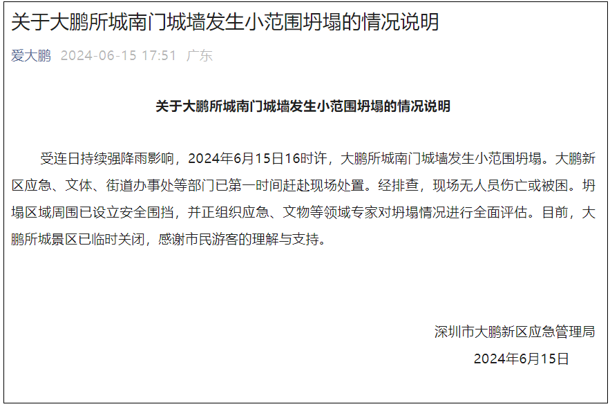 據深圳市大鵬新區綜合辦公室官方微信公眾號“愛大鵬”6月15日消息,受連日持續強降雨影響,2024年6月15日16時許,深圳市大鵬所城南門城牆發生小範圍坍塌。