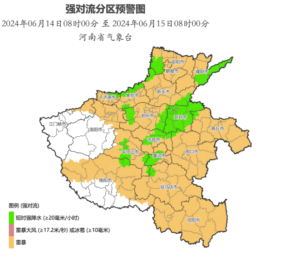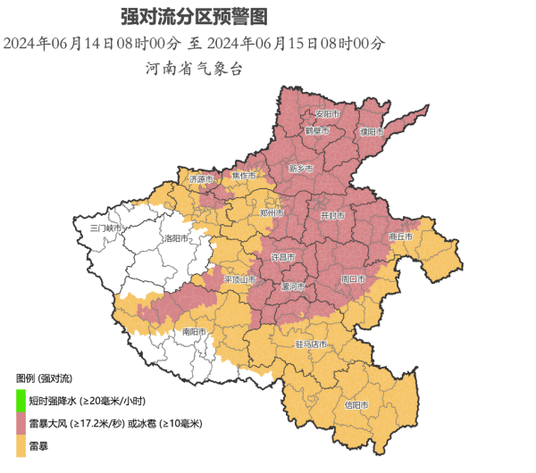 河南省氣象局網站消息,受低槽東移和地面冷空氣共同影響,6月14日河南全省大部有分散性陣雨、雷陣雨,北部、中東部部分縣市有8到9級(局地10到12級)雷暴大風、小時雨量30毫米以上的短時強降水、局地冰雹等強對流天氣。