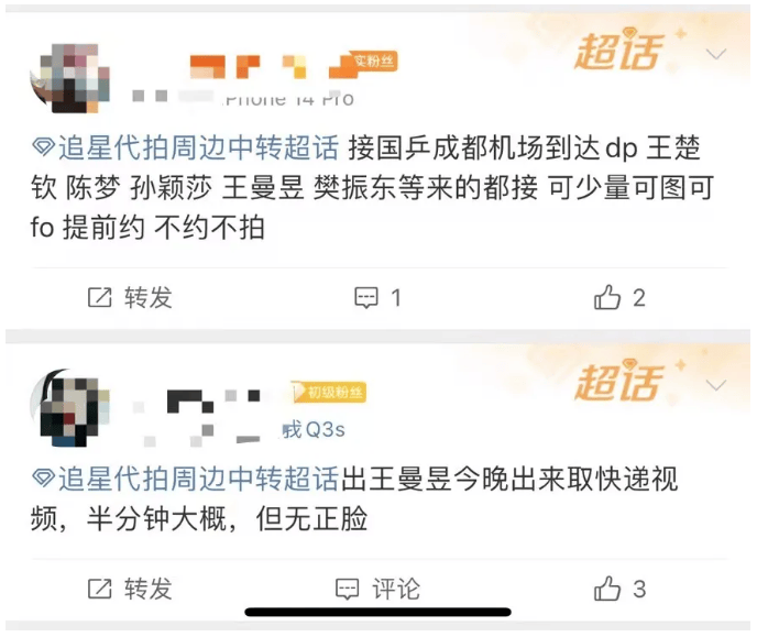 從售賣運動員航班、酒店信息甚至日常行程開始,一條完整的利益鏈便已經展開。在微博“追星代拍周邊中轉”超話內,“接某某運動員到達dp(代拍縮寫),可fo(直拍英文縮寫)可視頻”等信息並不少見,甚至有人發帖“出某運動員今晚出來取快遞視頻,半分鐘大概,但無正臉”。