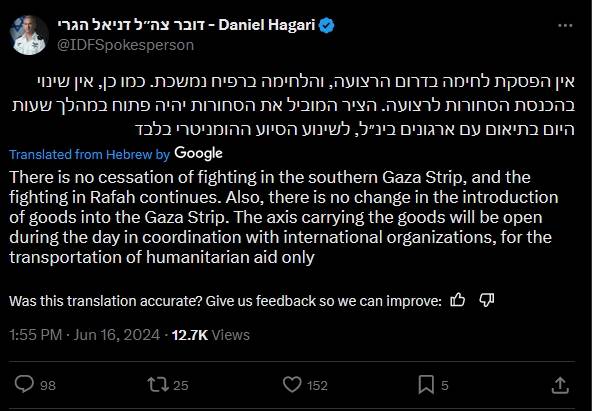 不過,以色列軍方發言人哈加里強調,儘管有局部“戰術性停戰”,但以軍在拉法等加沙南部地區的戰鬥沒有停止,仍在繼續。