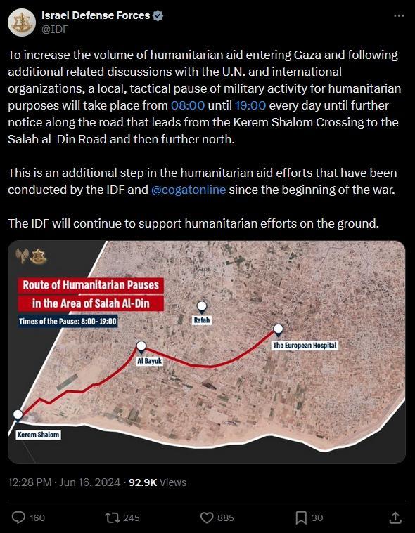 當地時間6月16日早間,以色列國防軍宣佈在加沙南部一條物資運送路線附近“局部戰術性暫停軍事活動”,以便人道救援物資出入,時間為當地時間每日8時至19時,直至另行通知。此前一天,以軍8名士兵遇襲死亡,巴勒斯坦伊斯蘭抵抗運動(哈馬斯)下屬武裝派別卡桑旅宣稱對此負責。