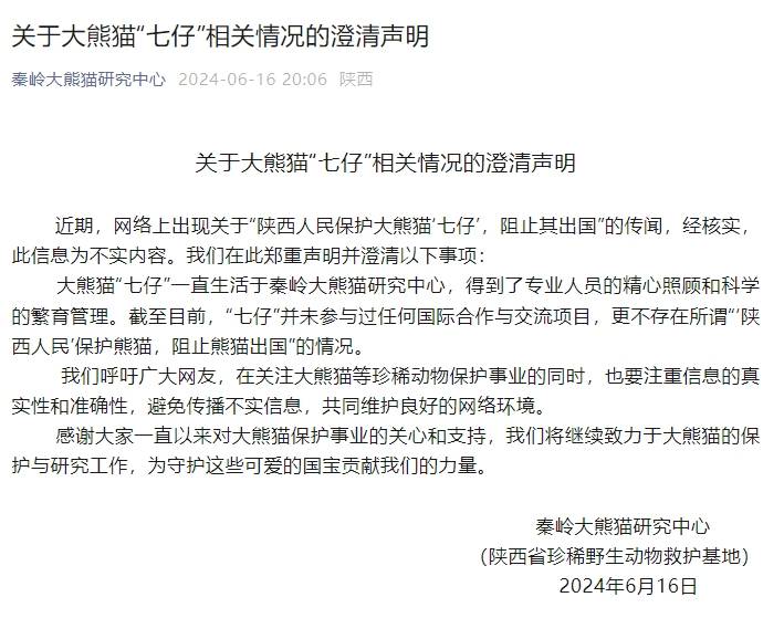 近期,網絡上出現關於“陝西人民保護大熊貓‘七仔’,阻止其出國”的傳聞,經核實,此信息為不實內容。我們在此鄭重聲明並澄清以下事項: