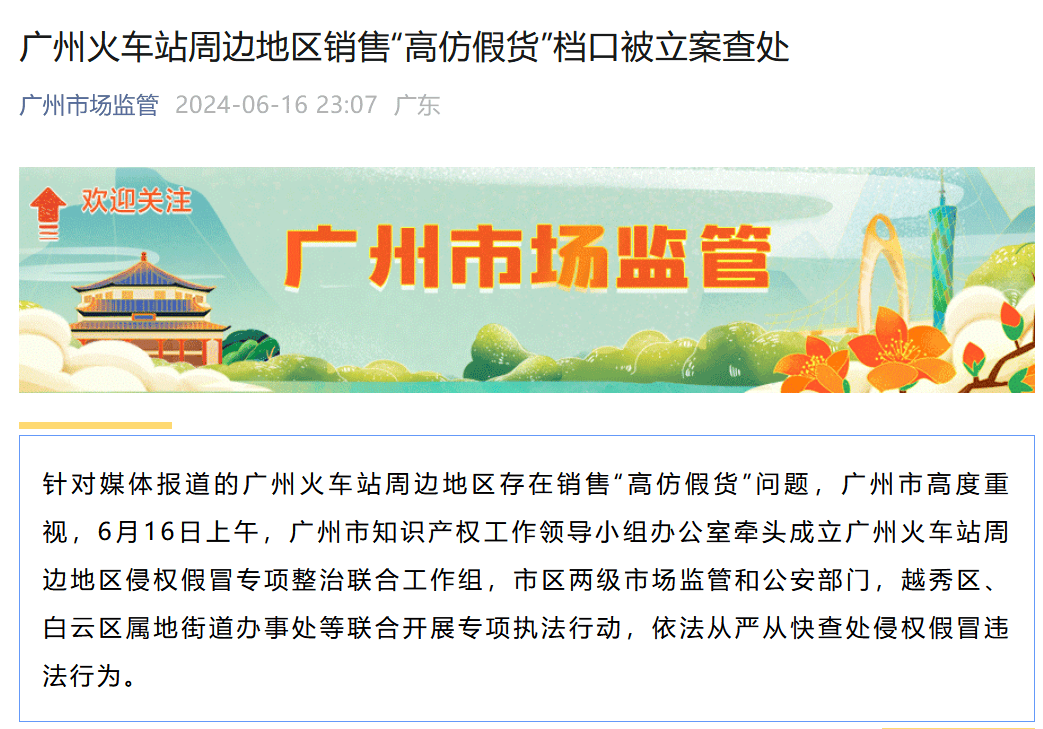 據微信公眾號“廣州市場監管”16日深夜消息,針對媒體報道的廣州火車站周邊地區存在銷售“高仿假貨”問題,廣州市高度重視,6月16日上午,廣州市知識產權工作領導小組辦公室牽頭成立廣州火車站周邊地區侵權假冒專項整治聯合工作組,市區兩級市場監管和公安部門,越秀區、白雲區屬地街道辦事處等聯合開展專項執法行動,依法從嚴從快查處侵權假冒違法行為。