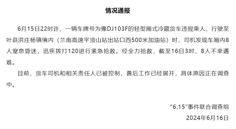 6月15日22時許,一輛車牌號為豫DJ103F的輕型廂式冷藏貨車違規乘人,行駛至葉縣洪莊楊鎮境內(蘭南高速平頂山站出站口西500米加油站)時,司機發現車廂內8人窒息昏迷,迅疾撥打120進行緊急搶救。經全力搶救,截至16日3時,8人不幸遇難。