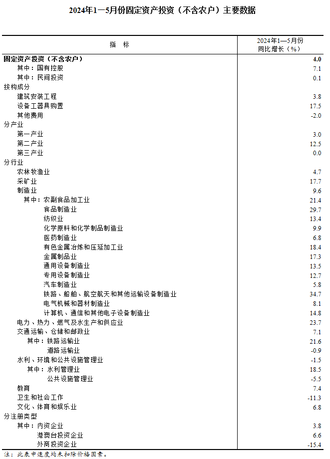 前5月全國固定資產投資增長4.0%,民間投資增長0.1%
