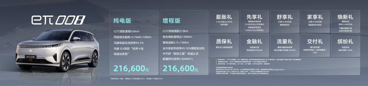 在動力參數上,eπ008 增程車型將搭載 1.5T 渦輪增壓發動機作為增程器(最大功率 108 KW、210 N·m),驅動電機最大功率 200 kW、340 N·m,CLTC 純電續航 210 km,CLTC綜合續航 1300km,官方饋電油耗 4.7 L/100km,快充時間 0.43 小時。