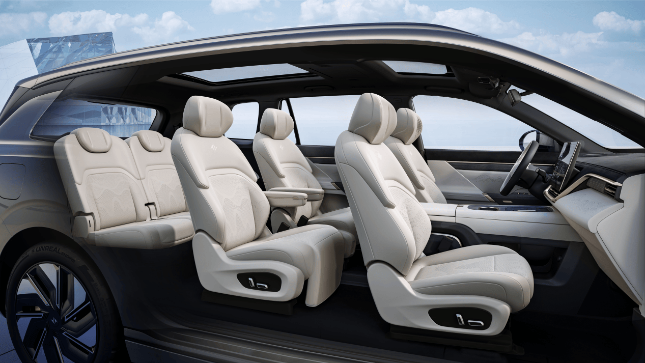 新車為 2+2+2 的 6 座佈局,在同價位較為罕見。新車二排過道寬度 180 mm,方便乘客上下車。此外,新車第二排均支持電動調節及通風加熱,右側提供零重力座椅,支持一鍵躺平、8 點按摩功能。