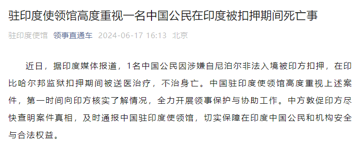 據外交部領事司微信公眾號“領事直通車”17日消息,近日,據印度媒體報道,1名中國公民因涉嫌自尼泊爾非法入境被印方扣押,在印比哈爾邦監獄扣押期間被送醫治療,不治身亡。