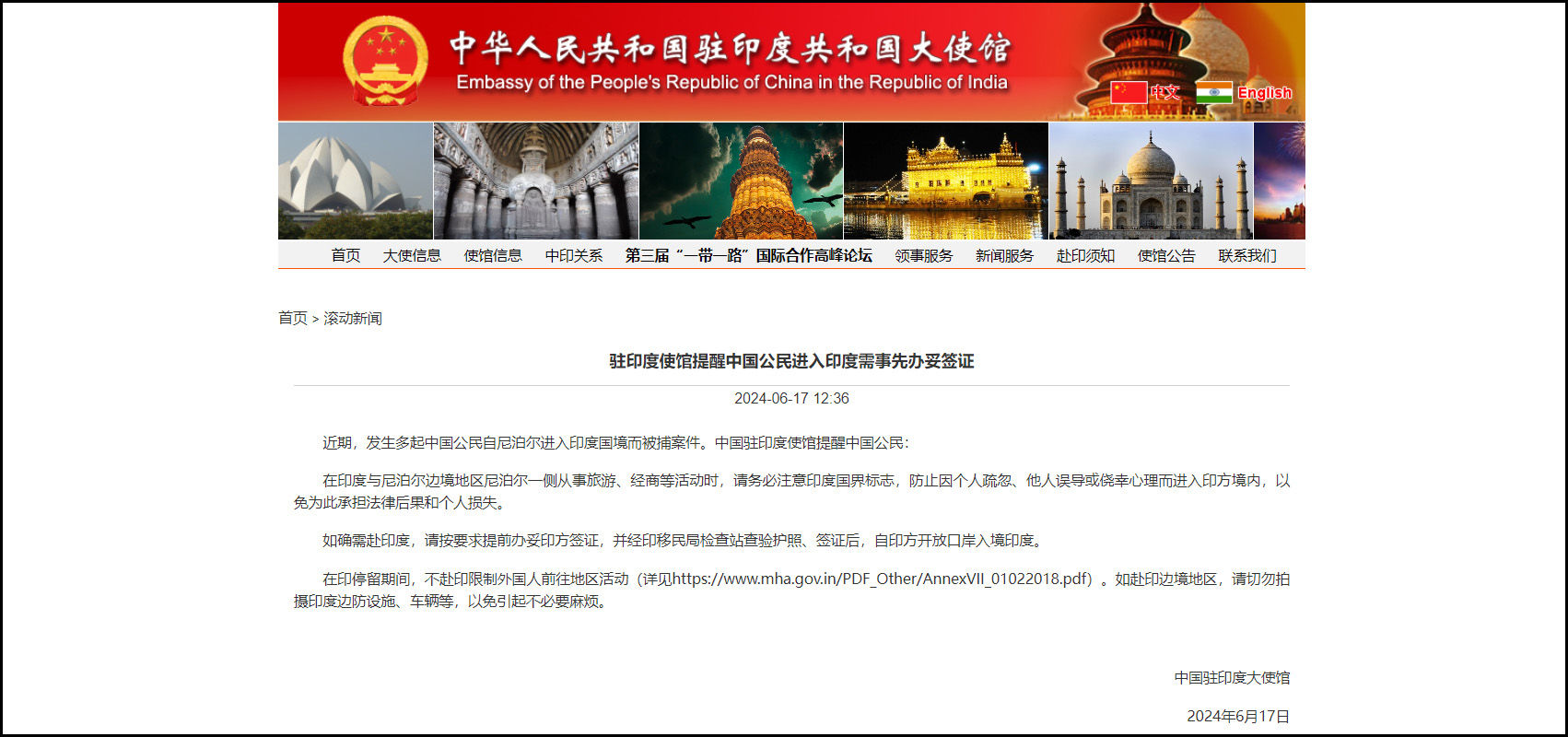中國駐印度大使館官方微信公眾號6月17日發文,提醒中國公民進入印度需事先辦妥簽證。