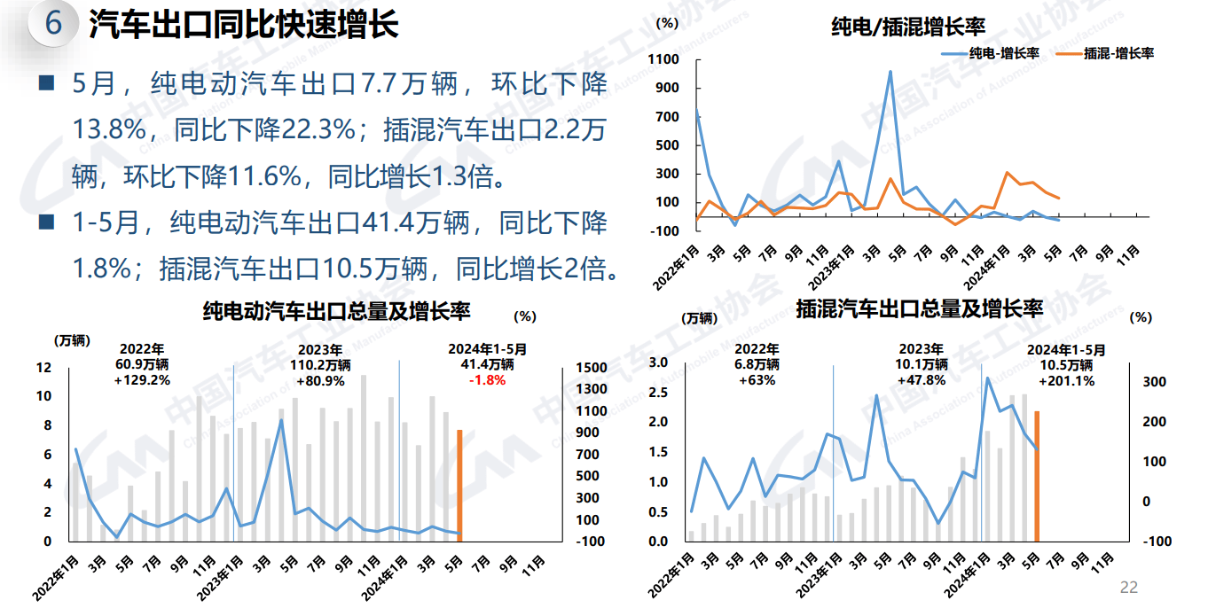 自2023年10月以來,純電動車型的出口量便始終在低位甚至負增長水平。今年1—5月,純電動車型出口共計41.4萬輛,同比下降1.8%。