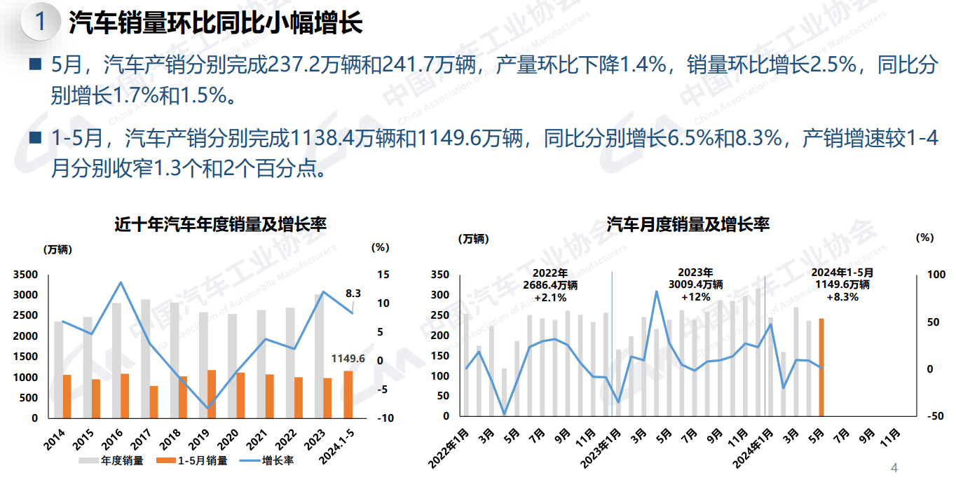 據中汽協統計,今年5月,中國汽車銷量共計售出241.7萬輛,同比增長1.5%。其中乘用車銷量207.5萬輛,同比增幅1.2%。兩項數據均創下2022年11月出現負增長以來,除春節因素影響外的單月最低漲幅。