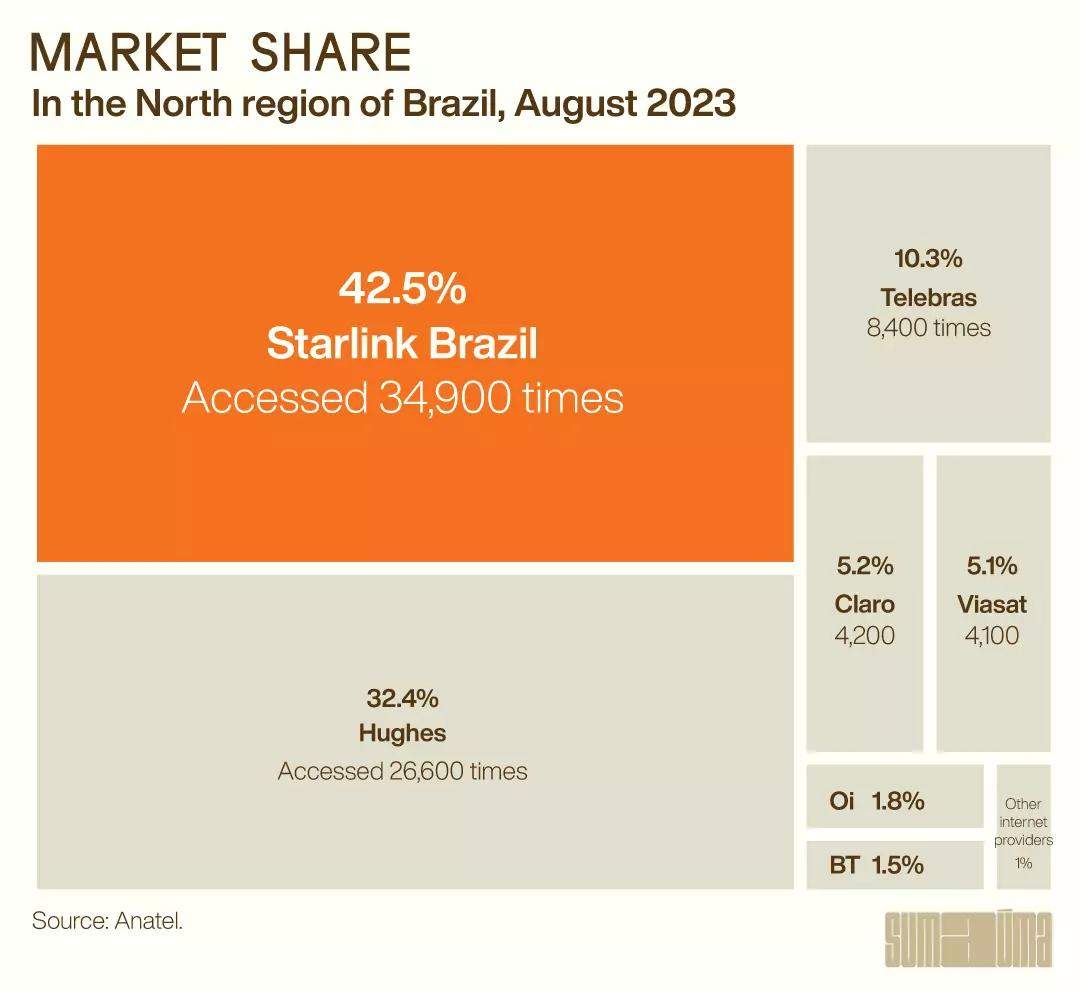 將視角放大到巴西全國,星鏈的市佔率更加驚人:
