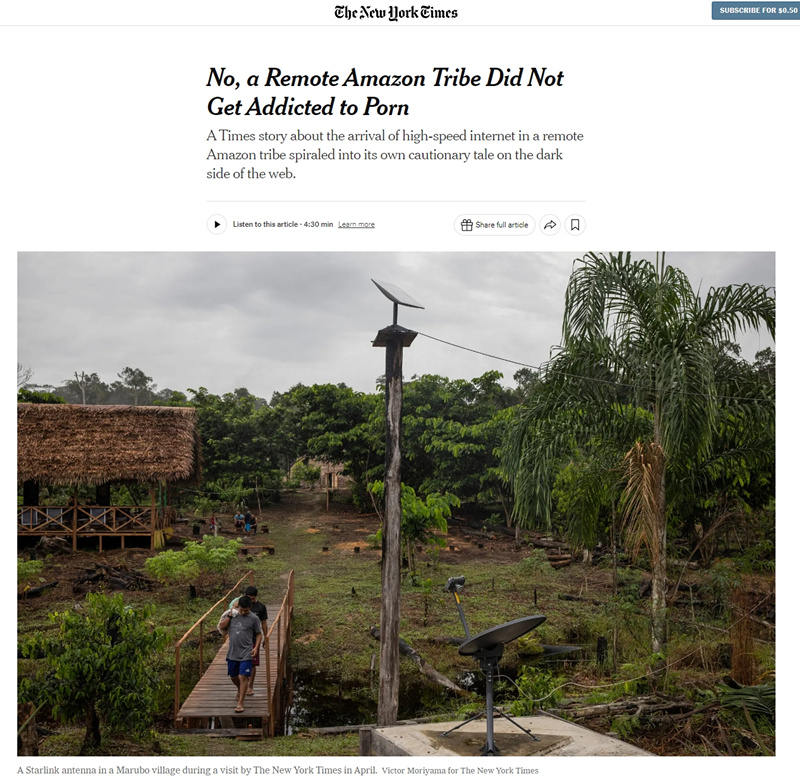 故事很有趣,但有一點令人不解:這篇報道採寫於今年4月,也就是星鏈抵達的7個月後。為什麼是這個時間點?《紐約時報》為什麼選擇這麼一個當不當、正不正的時候,派遣記者萬里迢迢地鑽雨林?