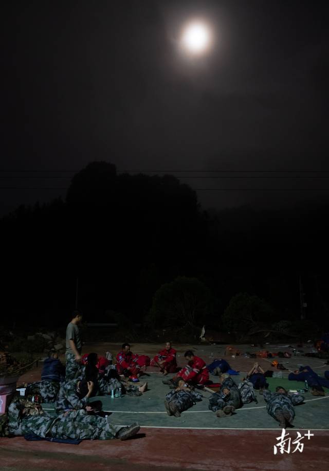 會議開完已是晚上11時,60名救援隊員直接躺在了大新村的操場上席地而睡,一位救援隊員説:“我們是結束了其他地點的救援後趕來的,已經兩夜沒閤眼。明天直升機就會帶更多救援力量和物資進來了。”