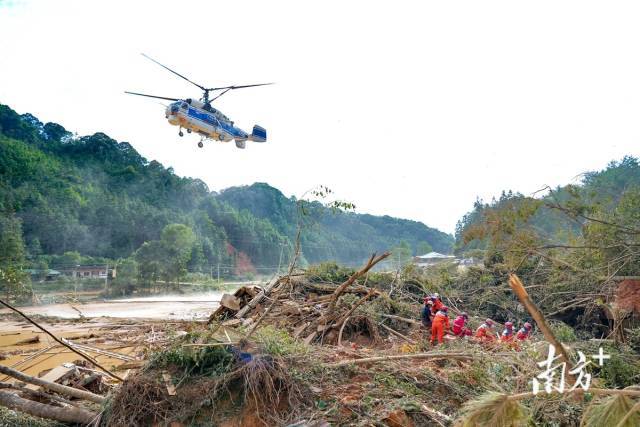 “清點了一下,有將近60人。”60人來自7支不同的救援隊伍,除了梅州本地的消防救援力量外,還有前來支援的河源市消防救援支隊、南雄市應急救援協會和曙光救援隊,他們分批乘坐直升機抵達大新村。