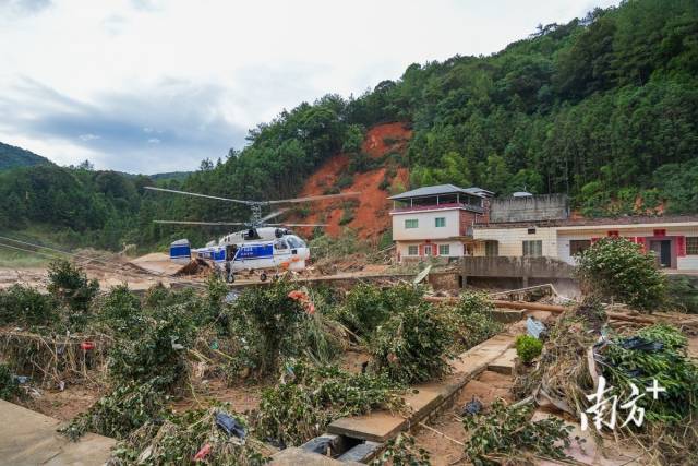 6月17日下午,南方+記者跟隨救援力量搭乘直升機進入了受災較嚴重的平遠泗水鎮大新村。該村發生了多處滑坡,有房屋被沖毀,出村道路受損嚴重,部分房屋一樓被浸,村裏隨處可見洪水侵襲的痕跡。在直升機抵達前,因通信信號中斷,受災狀況不為外界所知的大新村,成了“孤島”。