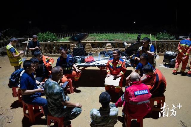 會議結束後,晚9時30分左右,無人機將照明燈升上空中並懸停,張玉華將村裏的救援力量召集起來,開了前線指揮部的工作會。他先是佈置了明日的救援分工,將隊伍安排到5個救援點開展工作,隨後聽取了不同救援隊伍的需求。