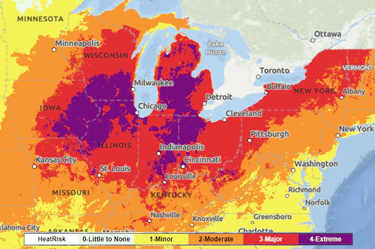 芝加哥、聖路易斯、印第安納波利斯、底特律、克利夫蘭、辛辛那提、匹茲堡、費城、紐約和波士頓預計都將達到4級高温風險,這是最高水平的高温風險等級,被描述為“罕見或長時間的極端高温,夜晚也不會緩解”。其它許多城市預計將達到3級高温風險。