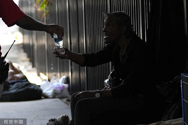 當地時間5月15日,美國邁阿密迎高温天氣,慈善機構向流浪漢發放救助物資。(視覺中國)