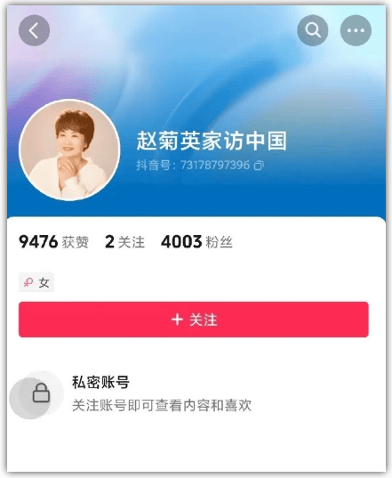 此外,趙菊英多個賬號如“趙菊英家庭教育”“趙菊英家訪中國”多為私密狀態,主頁顯示並未發佈作品。
