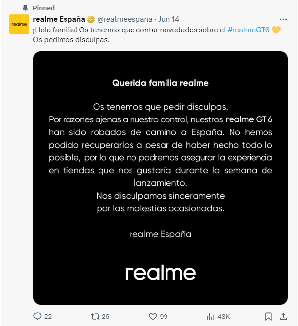 在社交媒體上,realme西班牙公司對給用户帶來的不便表示歉意,並強調他們正在努力解決供貨問題。