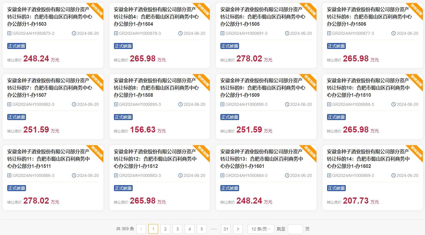 安徽產權交易中心官網顯示,自6月14日起,安徽知名老字號金種子酒突然大舉掛牌出售近百處辦公與住宅用房,披露時間截至6月20日,轉讓底價從14萬元至809萬元不等,合計達到1.626億元。