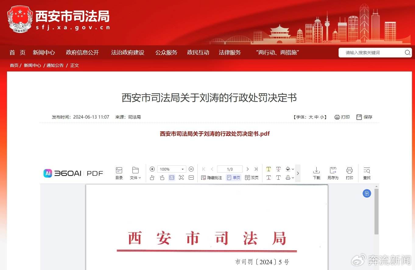 行政處罰決定書顯示,2024年3月6日,西安市司法局收到駐市委政法委紀檢監察組移交紹興市監察委員會關於陝西尊本律師事務所主任劉濤相關問題線索,西安市司法局於當日批轉雁塔區司法局調查核實。