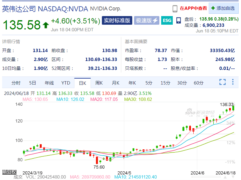 當地時間6月18日美股收盤,英偉達股價上漲3.51%,報135.58美元再刷歷史新高,總市值達3.335萬億美元,一舉超過了微軟和蘋果,成為全球最高市值股票。