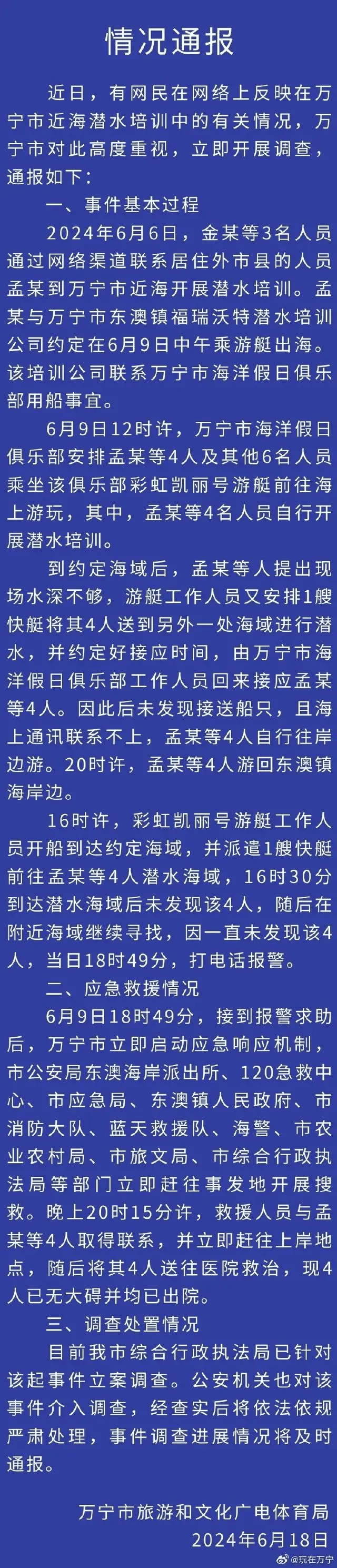 通報稱:近日,有網民在網絡上反映在萬寧市近海潛水培訓中的有關情況,萬寧市對此高度重視,立即開展調查。