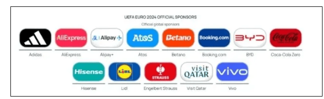 第一是中國贊助企業多,歐錦賽13家頂級贊助商,包括速賣通、螞蟻集團、比亞迪、海信和Vivo共5家中國企業,超過1/3的佔比。