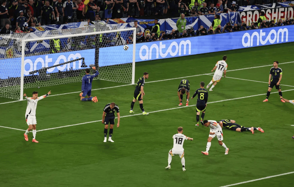 揭幕戰中,東道主德國隊5:1戰勝蘇格蘭隊,場邊廣告就出現了螞蟻集團的Antom。