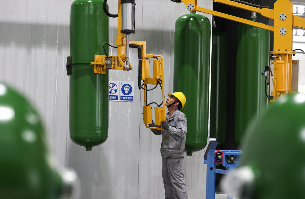 2024年5月31日,一名工作人員在江蘇國富氫能技術裝備股份有限公司的儲氫罐生產車間內作業。(新華社記者 楊磊 攝)