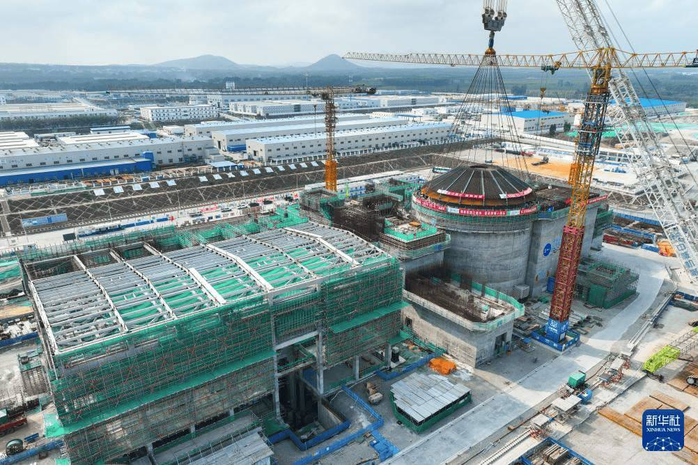 2024年2月6日,全球首個開工建造的陸上商用多用途模塊式小型壓水堆“玲龍一號”外穹頂在進行吊裝作業(新華社記者 張麗芸 攝)